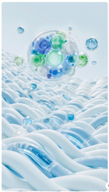 超写实3D渲染,整体色调变换为清新蓝白渐变,柔和的顶光源照亮画面,营造纯净通透的氛围。画面中心是一个半透明的基因双螺旋,内部包含分子结构模型和悬浮的小气泡,双螺旋被流畅的波浪状液体环绕,液体呈现出清澈的蓝白色,带有细腻的光泽和高光。周围散布着大小不一的透明小分子结构模型,整体元素排布规整对称,保持液体的动态感与流动性,背景为渐变的浅蓝白色,干净简洁,无任何文字和标识,突出主体的科技感与纯净美感。
