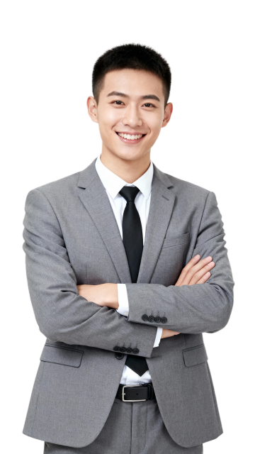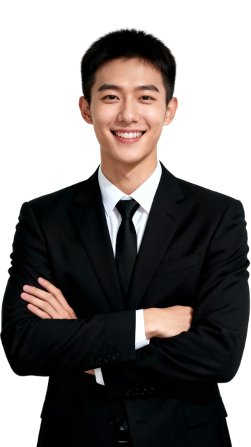 一位年轻亚洲男性,身着剪裁合体的黑色西装,内搭白色衬衫,系着黑色领带,左手自然插在西装裤口袋,右手轻握西装前襟,面带温和微笑,姿态自信挺拔,背景为纯白色,整体呈现清晰、专业、正式的商业人像摄影风格,光线均匀柔和,突出西装的挺括质感与人物的精神面貌。