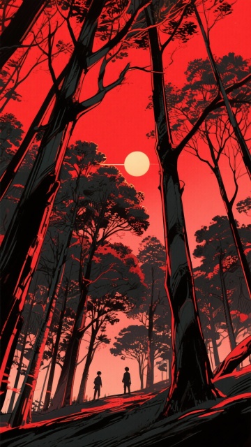 写实日漫,红黑色,山顶树林,杂草,正面全景构图大气、燃,细节丰富,16:9,不要人物,生成2张
