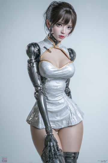 Concept art of a beautiful anime girl with an exquisite face, large detailed eyes. She has mechanical robotic arms and legs, but her torso remains human and attractive with soft skin texture. Extreme hourglass figure, slim waist, wide hips. Body proportion is stylized with very long legs (3:7 body ratio). Wearing a modified kimono top. Dynamic pose, white background, masterpiece, high detail, 8k resolution --ar 2:3 --style raw --niji 6