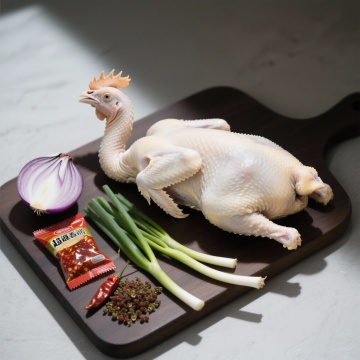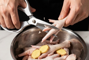 特写镜头下,不锈钢盆中铺满大量被切成小段的新鲜辣椒,辣椒段呈现出鲜明的色彩分区,从左到右依次为鲜亮的黄色、热烈的红色和清新的绿色,色彩过渡自然且对比强烈,辣椒籽与辣椒肉的纹理清晰可见,充满质感。一只手握着中式菜刀正从红色辣椒区域向下切剁,刀刃上沾着细碎的辣椒末,动态感十足,背景为深色,突出主体辣椒的鲜艳色彩和切割动作的生动性,整体画面光影柔和,聚焦于辣椒的丰富色彩和切割瞬间的鲜活感,营造出充满活力和烟火气的烹饪场景氛围。