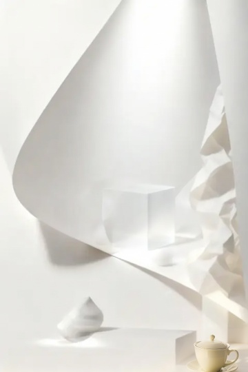 三个白色几何体展示台,由两个大小不一的白色圆柱体和一个白色半圆柱体组合而成,圆柱体表面光滑无纹理,半圆柱体切面平整,整体呈现简洁的现代设计感,所有展示台均采用哑光白色材质,放置在纯白色背景上,光源从左上方照射,在展示台右侧及底部形成柔和的灰色阴影,阴影边缘清晰但过渡自然,整体画面干净利落,具有强烈的空间层次感和极简主义风格。