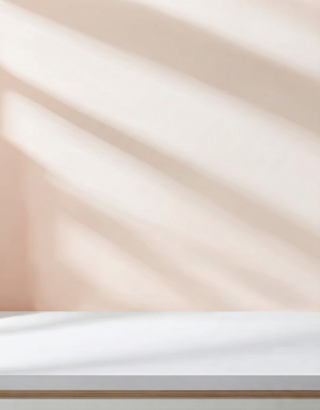 极简主义展台设计,采用低饱和度的米色和柔和金色为主色调,圆形展台台面呈现光滑的金属质感,表面有细腻的光影反射,背景为模糊的暖色调光斑,光线从上方斜射下来在台面上形成自然的明暗过渡和柔和阴影,整体氛围优雅、简约且具有高级感,没有任何多余的装饰元素,突出展台本身的形态美和材质感。