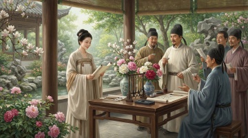 古典中式插画,国潮风唯美感,优雅文艺,水墨鎏金,人物雅集,意境深远。