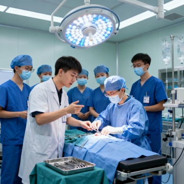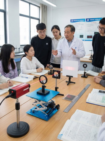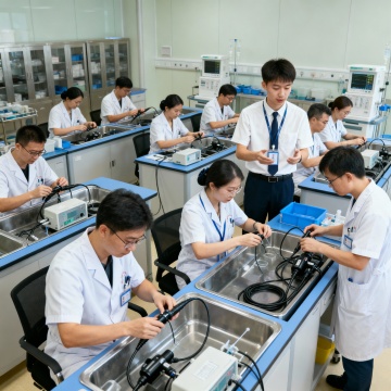 现代化高科技实验室场景,画面干净规整,适合作为背景。明亮的白色与蓝色调为主,洁净的白色墙面镶嵌着深蓝色方块瓷砖,地面为光滑的浅灰色。前景有两位身着全套白色防护服、佩戴护目镜和口罩的科研人员,一位正坐在操作台边专注查看电脑屏幕,另一位站立于大型精密仪器前操作控制面板。实验室中央和后方分布着多台先进的白色与银色相间的分析仪器、设备,带有蓝色显示屏和控制面板,仪器间有金属管道和电缆有序连接。右侧有机械臂装置,左侧前景有透明玻璃容器和绿色植物点缀。整体光线均匀柔和,以冷色调为主,营造出专业、严谨、先进且一尘不染的科研氛围,构图平衡,空间感强,视觉层次分明,信息传达清晰,符合高科技科研环境的审美与功能需求。