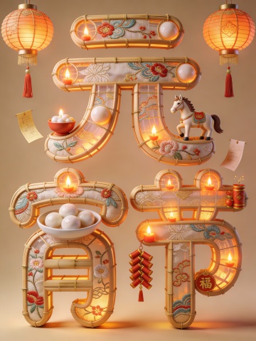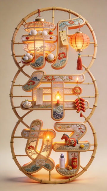 Greg Rutkowski 风格 3D 灯笼字“除夕”,每一笔皆由精细金色灯笼纹理构成,灯笼纹理真实、细密、层次分明,具有东方节庆质感,边缘柔化处理,细节圆润不过硬。极简纯红色背景,干净、克制、高级,纵向构图,主体居中正视图。 整体光影层次丰富而克制,主光柔和、辅光精准,具有大师级光影控制能力。OC 渲染风格,16K 超高清输出,极致细节表现,纹理、光影与材质全部拉满,整体呈现高级东方审美与现代极简结合的高端视觉风格。 画面为高清平面海报设计,色彩高度克制,极简几何构成,留白充足,整体氛围轻盈、安静、充满新一年开始的仪式感,不喧闹、不堆砌节日元素,偏高端品牌新年主视觉。 左侧文字区排版设计: 顶部: 极细手写体英文,极小字号 “HAPPY CHINESE NEW YEAR”,时间信息区(上下排布): 小号无衬线字体 “HORSE YEAR” “大年三十” 底部祝福文案小字号无衬线中文“阖家欢乐 辞旧迎新”整体文字排版轻盈、克制、呼吸感强,与主体灯笼字保持明确视觉层级,不抢主体、不制造拥挤感。整体风格为极简、高级、安静的新年视觉表达。