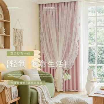 将窗帘的颜色变成粉色,不要改变外面一层白纱的材质和花纹,也不要改变字体排版布局,场景中的家具可以适当改变颜色、