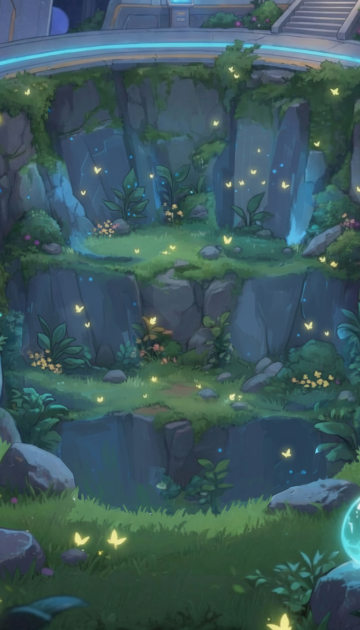 梦幻插画风,虚拟自然场景,古老石墙与神秘蓝光交织,营造奇幻氛围。