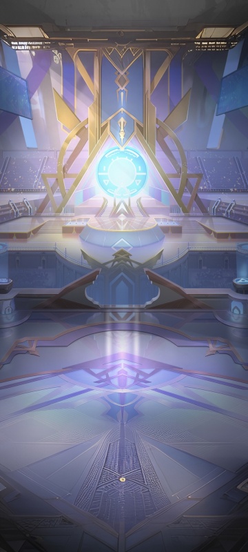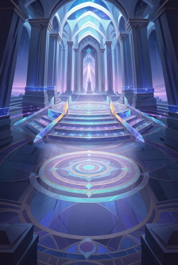 梦幻星空下,哥特式拱门环绕破碎玻璃地砖,几何纹路交织粒子光流,插画风呈现神圣神秘的虚拟现实之境。