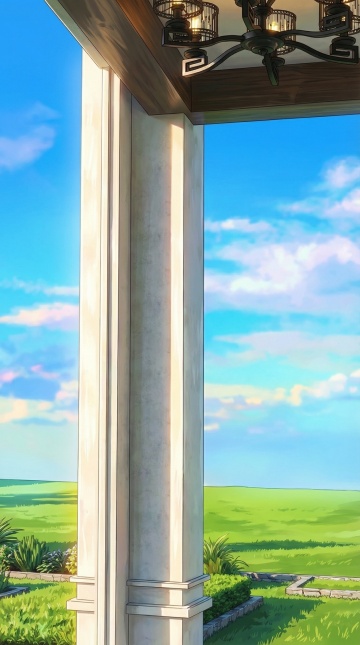 清新插画风,虚拟自然景观,蓝天白云下绿意盎然,营造宁静夏日氛围。