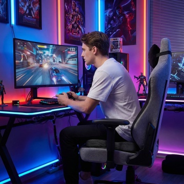 赛博朋克风科技感场景,霓虹灯与金属质感交织,潮流青年手持未来感耳机,展现数字时代先锋美学。