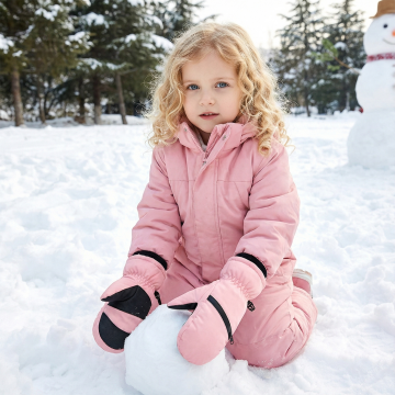 保持手套细节不变,分清正反面,一个外国小女孩穿着这双手套在雪地玩耍