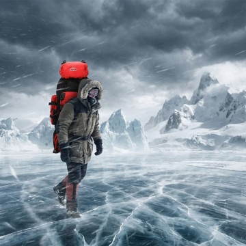 保持手套细节不变,分清正反面,一个外国帅哥穿着这双手套在雪地登山