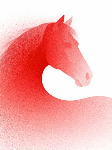 梦幻感与唯美感交织,白描线条勾勒骏马轮廓,粒子风点缀星芒,浮雕质感跃然纸上,插画风呈现优雅意境,暗红底色衬托节日祥瑞之气。