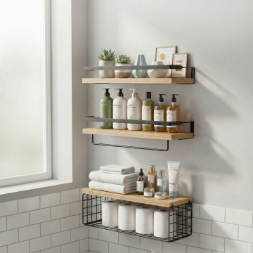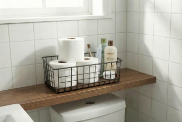 极简主义风格的卫生间室内设计,柔和的米白色与浅灰色调为主,整体明亮通透,自然光透过隐形光源均匀洒入,营造出干净、宁静、高级的氛围。浴室中央是悬挂式米白色洗手台,台面光滑整洁,台上放置简约设计的水龙头和几瓶透明瓶装洗漱用品,台下有隐藏式抽屉和开放式储物格,内置叠放整齐的毛巾与洗漱用品。洗手台上方是带LED灯带的长方形镜面柜,柜内隐约可见折叠整齐的毛巾,镜面清晰映照出浴室景象。右侧是白色壁挂式马桶,线条流畅。左侧为透明玻璃淋浴房,内部有简约的置物架和手持花洒。墙壁采用大块浅色瓷砖铺设,地面是光滑的白色大理石瓷砖,整体空间布局紧凑有序,功能分区明确。金属色毛巾架上挂着白色毛巾,与整体色调和谐统一。设计注重空间的简洁性与功能性,无多余装饰,强调材质本身的质感与光影的细腻变化,呈现出现代、简约、舒适的卫浴空间。