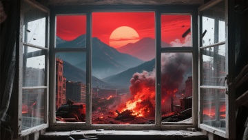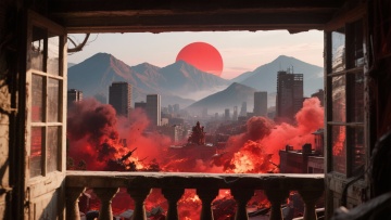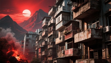 写实,夜晚城市楼顶战场,群山,太阳,红色,特写构图,氛围燃,细节丰富,素材多样,16:9,不要人物,生成2张