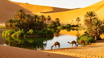 剪影风沙漠日落,驼队行于沙丘,枯树伫立,光影交织如油画,静谧中透出实景感。