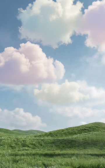 3D渲染风格的自然背景,广阔的绿色起伏草原,草叶茂密且带有细腻纹理,点缀着零星蓝色小花,远处有一棵孤立的小树,上方是明亮的蓝天,漂浮着形态饱满、边缘柔和的白色积云,整体光影明亮柔和,呈现出宁静开阔、充满生机的氛围,色彩以翠绿和蔚蓝为主,过渡自然和谐,画面具有清晰的景深和空间感。