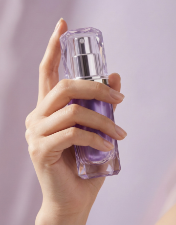 玻璃风几何瓶身,清透紫调搭配柔和光影,轻拟物设计展现优雅与奢华,简约主义美学诠释时尚感。