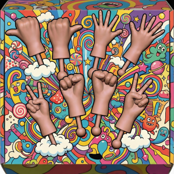 六个不同配色、不同样式的卡通素材,白色背景,排列整齐。每个卡通形象都具有圆润的轮廓、大大的黑色圆形眼睛、红色圆形腮红和微笑的嘴巴,色彩鲜艳明快,包括黄色、粉色、绿色、蓝色、橙色、紫色等。第一个是黄色六边形,带着思考的表情和气泡;第二个是黄色星星,戴着粉色冰淇淋;第三个是绿色花朵,周围有音符和箭头;第四个是蓝色方形,带着微笑;第五个是橙色三角形,戴着蓝色帽子;第六个是蓝色不规则形状,戴着耳机听音乐。每个卡通形象都有独特的装饰元素,如线条、星星、音符等,整体风格可爱、童趣,充满活力。