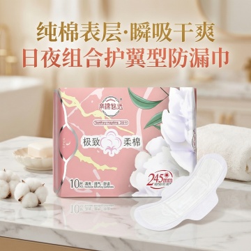 我是网店卖家,产品是女士生理期用品卫生巾,根据你的经验帮我生成一个电商主图,/提升一些包装质感,切记不要出现网络违禁词,略微提升质感包装袋生成的包装主体不能改变,/背景可以更换更适合产品的高级背景/突显高级感/,/图片分辨率大小保持在800*800的像素不变/图片大小不变/、/可以发挥你的想象把产品布局摆放到更合适的位置/根据产品主推特点纯棉表层姨妈巾日用夜用组合瞬吸干爽护翼型防漏巾/结合网络热销同款产品的标题生成主图产品标题//标题色彩要鲜艳精致一些/