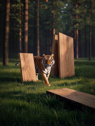 鎏金白虎腾跃于虚拟自然,3D光影交织,粒子流光环绕,神圣威严中透出梦幻奢华,视觉冲击力十足。