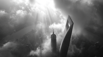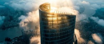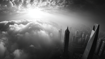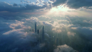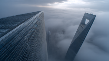 核心描述: 令人眩晕的垂直俯视上帝视角,特写镜头直视上海中心大厦顶部的V型螺旋缺口。 细节与构图: 右侧可见金茂大厦的塔尖,两座摩天大楼穿插在流动的云雾中。 光影与氛围: 白色的薄雾像丝绸一样在建筑间快速穿梭,柔和的体积光束斜射穿过雾气。低饱和度,冷灰色调,充满科技感和神秘感。 质感: 玻璃幕墙的冷硬质感,云雾的柔和质感,超高清,8k分辨率。
