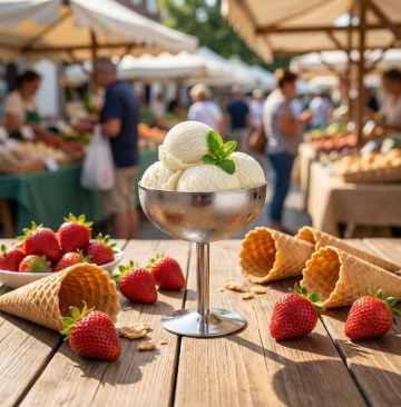 奶油风冰淇淋,甜美清新,厚涂质感,轻拟物设计,海边花丛中,夏日清凉。