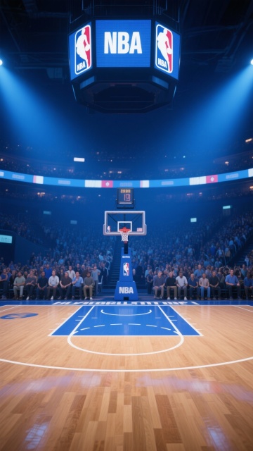 一个篮球比赛场馆的游戏画面,场馆内坐满了观众,气氛热烈。场地中央是木质的篮球场,视觉能看到篮球场场地中央,篮球架位于远端。上方悬挂着nba电子屏幕。整个画面呈现出夜晚比赛时的场景。