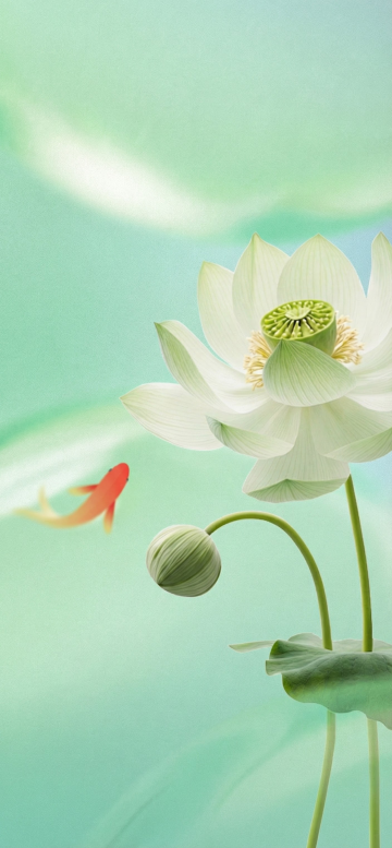 俯视角构图,清晨薄雾笼罩的荷塘深处,三朵形态各异的荷花构成黄金三角布局——右侧一朵盛放的粉白渐变荷花低垂着,花瓣边缘泛着晨露的珍珠光泽,中央金黄花蕊中栖息着一只振翅欲飞的青色蜻蜓;左上方半开的花苞裹着淡粉轻纱,露珠正沿着螺旋状花瓣缓缓滑落;左下方一片被虫噬出镂空纹理的深绿荷叶托起半透明的水珠,阳光穿透薄雾在叶面形成丁达尔光束,照亮叶脉间游动的微生物,背景虚化的墨绿色荷叶群中隐约可见鸳鸯的倒影,整体色调以薄荷绿为基底,点缀胭脂粉与琥珀金,营造出雨后初晴的湿润生机。
