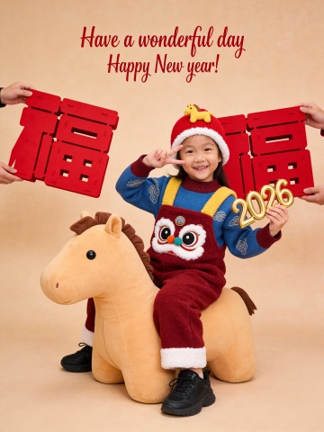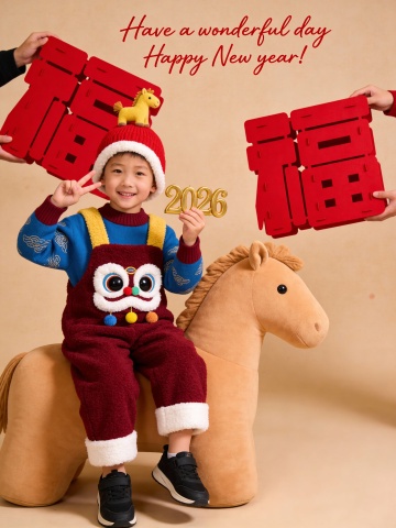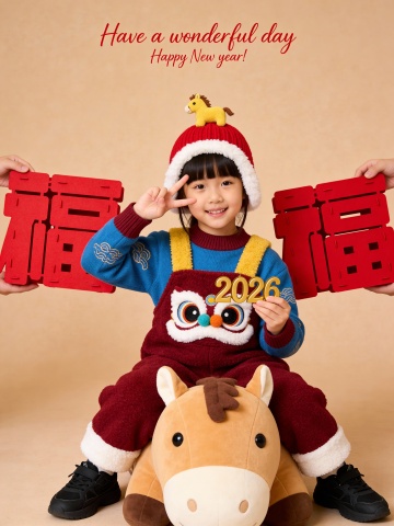卡通感十足的儿童新年照,融合刺绣风舞狮元素与拼贴式“福”字,喜庆可爱,传递2026新春祝福。