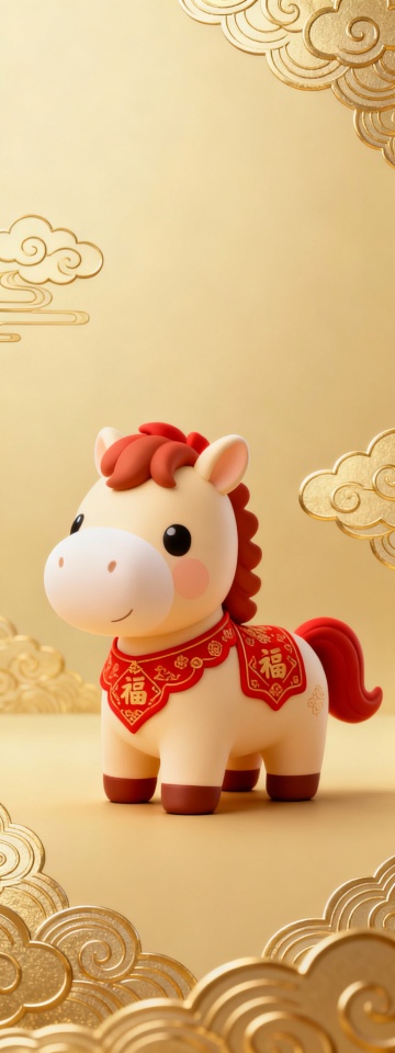 国潮风软3D卡通马抱金元宝,毛发生长质感搭配刺绣浮雕云纹,喜庆红金配色,祥云锦鲤环绕,传递新年暴富好运。