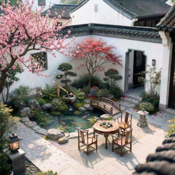 夜幕低垂,京都古寺的朱红色鸟居下,一条被粉白色樱花完全覆盖的幽静参拜道蜿蜒向前,千年古樱的虬曲枝干上缀满夜樱,在深蓝色夜空下泛着神秘的幽光,花瓣如同被月光唤醒的精灵般簌簌飘落,小径上积着厚厚的一层粉白"雪毯",远处传来隐约的晚钟声与琵琶声,地面上灯笼的暖黄色光晕与夜樱的冷粉色形成微妙对比,空气中弥漫着古老木材与樱花的混合香气,远处山峦如墨色剪影般静默矗立。