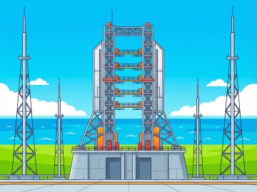 科技感十足的火箭发射台,融合未来感与工业风,采用扁平风与描边风设计,几何线条简洁有力,金属质感突出,背景海洋与蓝天呼应,展现现代航天美学。