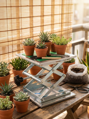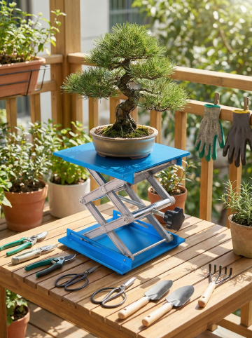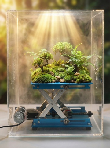 生态造景师使用升降台在狭窄的玻璃缸内精确摆放石头和沉木,构建山水微缩景观,工具细长精巧。 比例3:4