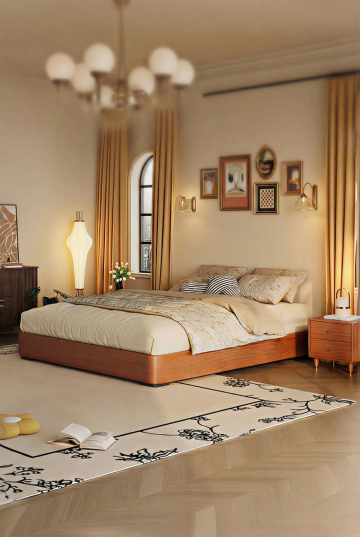 把衣柜换成胡桃色实木衣柜,旁边窗户外有田野场景
