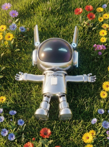 场景设计。让图中的机器人躺倒在草地上四周有鲜艳的花朵围绕。四肢张开,眼睛舒服着眯起来。画面协调,光影自然。3D建模,C4D模型。