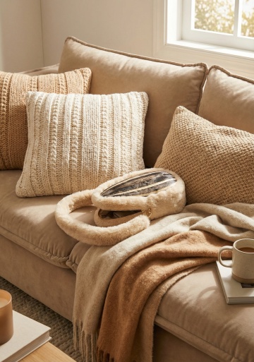 极简主义风格室内场景,浅米色布艺弧形沙发,搭配几个同色系靠垫和一个橙色花纹抱枕,沙发下方是浅灰色编织地毯,前方有一张黑色细腿圆形小茶几,上面放着几本书和一个装饰品,背景墙挂着一幅线条简约的抽象画,左侧有一扇窗户,挂着浅色半透明窗帘,窗边有一个黑色金属框架的边几,右侧有一盆大型绿植,天花板悬挂着一盏黑色金属吊灯,整体色调以米白色、浅灰色为主,光线柔和明亮,营造出宁静、舒适、简约而不失格调的氛围。
