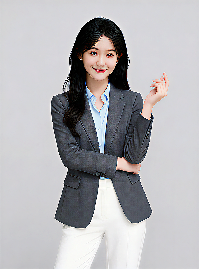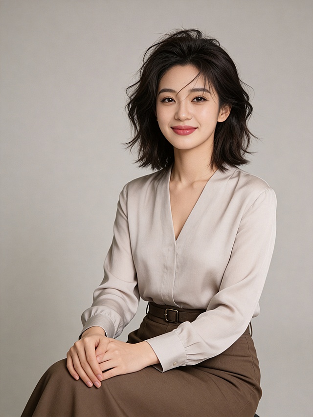 参考图中保留人物脸型、发型、年龄等特征生成职场形象照,保持人物不变,更换为深卡其色精纺羊毛混纺西装外套,西裤同色,更换全新不同手势和姿势,调整手指位置,保留耳环,简约微微暖调浅灰色纯色背景,画质超高分辨率、细节清晰,现代精致感风格;肤质精细化处理;眼神直视镜头,目光坚定且澄澈,表情自然,嘴角上扬;肤色均匀,柔光美白细腻陶瓷肌肤,哑光肤质,肤色均匀提亮;杰作,最佳画质,超高细节,写实摄影,中近景人像,皮肤细腻通透,白皙清透皮肤,柔光,正面补光,画面干净清新,高清皮肤细节;面部光比1:1.5,4800K中性光,微微修饰脸型,肤质哑光细腻,面部雾面柔光,轻透裸肌感,真实毛孔纹理;分辨率4K,严格保留原人物特征详情
