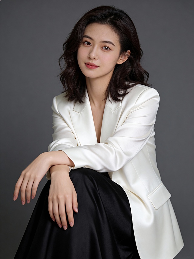 温柔白色上衣黑裙子坐姿女士形象照详情