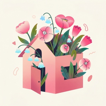插画风小屋绽放粉色花朵,融合扁平与轻拟物设计,清新梦幻,传递春日甜蜜与可爱感。