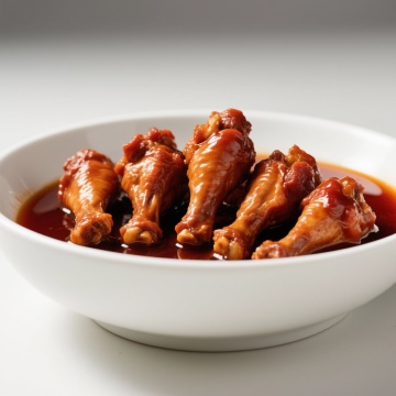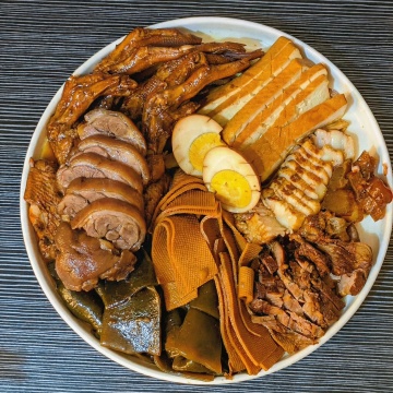 卤味实物图生成,白色盘子里装着卤藕片、卤短节的鸭脖、卤鸭翅、卤土豆片和卤鸭翅和卤鸡腿,卤汁红亮浓郁,食材表面泛着油光,看起来软烂入味,极具食欲