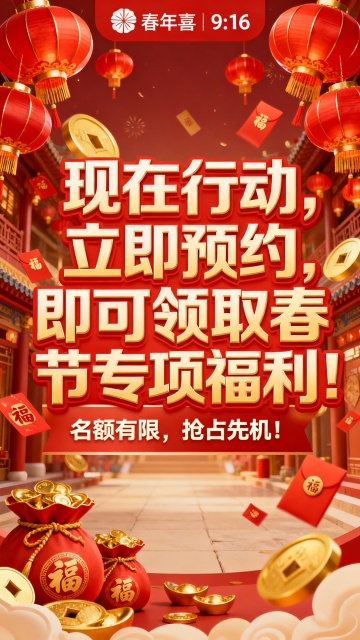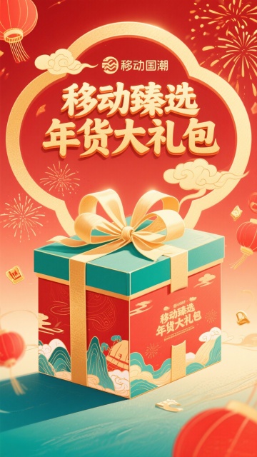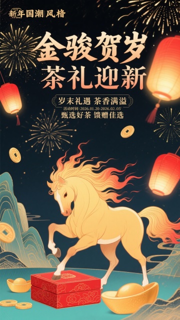国潮插画风,鎏金重拟物手法呈现金马踏礼盒,搭配粒子烟花与红灯笼,营造喜庆中式新年氛围。