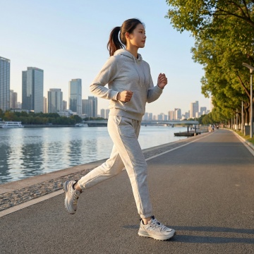 写实风格摄影,一名穿着深色运动背心和黑色短裤的男性正在奔跑的背影,肌肉线条分明,姿态充满动感与力量,跑鞋细节清晰可见,阳光从侧后方照射,在人物身上形成明亮的轮廓光和明显的阴影对比,画面整体色调温暖,以金色和蓝色为主,高清晰度,细腻的质感表现,将原有的乡村道路环境改为清晨的城市滨江步道,地面铺设平整的灰色塑胶跑道,道路一侧是波光粼粼的江面,另一侧是整齐的绿化带和路灯,远处可见城市的天际线和朦胧的晨雾,保持原有的逆光拍摄角度和阳光效果,营造出清新、充满活力的运动氛围。