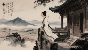 古典中式工笔风,水墨渲染山水背景,文人雅士静读古卷,意境深远。