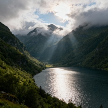 远景:连绵起伏的山地景观,山峰呈现出深灰色的岩石质感,部分山顶覆盖着少量积雪,山体轮廓清晰。天空中布满了白色的云层,云层层次丰富,光线透过云层形成自然的明暗对比。