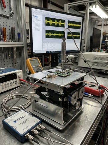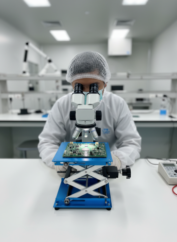 学或物理实验室一角,在一个铺有防震毯的台面上,两个手动升降台分别作为支撑点,共同架起一根光学导轨,导轨上装有激光器和功率计探头。中国研究员正在调节其中一个升降台的高度来对齐光路。场景复杂但有序,突出升降台的模块化与灵活性 比例3:4