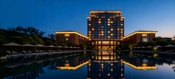 一座宏伟的现代风格酒店建筑,在黄昏时分的蓝色天空下,建筑顶部和底部有温暖的金黄色灯光勾勒轮廓,大量明亮的窗户透出内部光芒,前方有平静的水池,水面清晰倒映着建筑和灯光的美丽光影,周围有绿树和户外遮阳伞区域,整体呈现出高端、宁静且奢华的氛围,具有高度写实的摄影质感,光影细腻,色彩和谐。