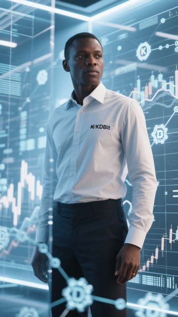 A Congolese professional standing in a futuristic blockchain environment, lightly touching a floating holographic KKDBit trading dashboard. Flowing data streams, cryptocurrency symbols, and digital grids in the background. Spotlights highlight the subject, soft blur on surroundings. Blue and silver tones. Text in the background or floating above: “EIG nous laissera jamais tomber”. Ultra-realistic, vertical 9:16.