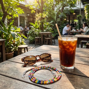 一杯装有精美树叶形状拉花的拿铁咖啡,置于透明玻璃杯中,杯子放在编织纹理的棕色杯垫上,背景改为阳光明媚的户外露台,摆放着简约的木质桌椅,周围有绿色植物点缀,整体保持高清写实风格,柔和的自然光从侧面照射,形成清晰的光影层次和温暖的色调,营造出悠闲惬意的氛围。